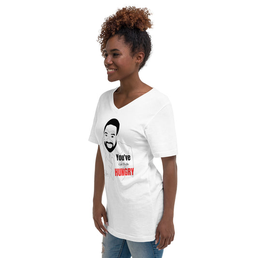 Transforming Tees: "You've Got To Be HUNGRY!" Women's Short Sleeve V-Neck T-Shirt - Front Design